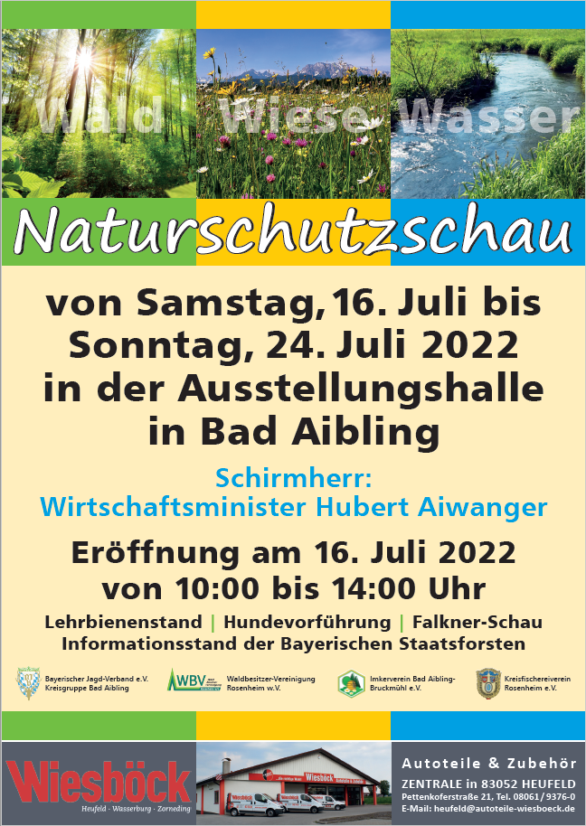 10.06.2022 Naturschutzschau in Bad Aibling Von Samstag den 16. Juli bis Sonntag den 24. Juli 2022 findet in der Ausstellungshalle in Bad Aibling eine Naturschutzschau statt. Die Veranstaltung geht auf die Initiative der Jagdgruppe Bad Aibling zurück, an der sich auch der Kreisfischereiverein Rosenheim, der Imkerverein Bad Aibling und die Waldbesitzervereinigung Rosenheim beteiligen. Ziel ist es der interessierten Öffentlichkeit näher zu bringen, was Jagd, Fischerei, Forstwirtschaft und Imkerei für die heimische Natur leisten. Die Ausstellung ist an Wochentagen von 9.00 Uhr bis 13.00 Uhr für Schulklassen geöffnet und an den Wochenenden von 9.00 Uhr bis 17.00 Uhr für die breite Öffentlichkeit. |